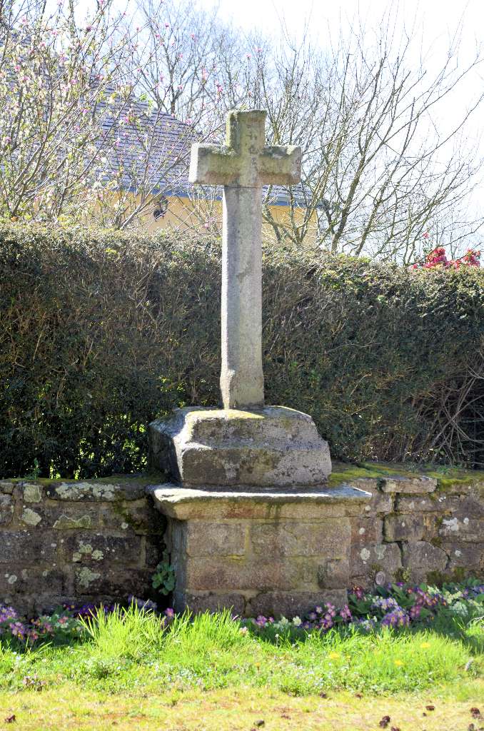 Croix de mission Dans un enclos dont les deux piliers d'entrée supportent chacun une statue en fonte, à gauche la Vierge, à droite Saint-Jean. Emmarchement 4 degrés, soubassement en forme d'autel, en pierre de taille. Socle de forme trapézoïdal, chanfreiné et mouluré, sur chaque face était fixée une plaque de marbre blanc de Carrare avec une liste de noms gravés, celle en façade à disparue, celle coté nord/ouest est brisée et les morceaux sont au sol. Fût écoté, nÂud aux motifs de fleurs de lys, croix de section cylindrique, Christ en croix. Les fleurons et le titulus ajouré ont disparus. Socle, fût et croix, réalisés par l'atelier Hernot de Lannion. 19ème s.