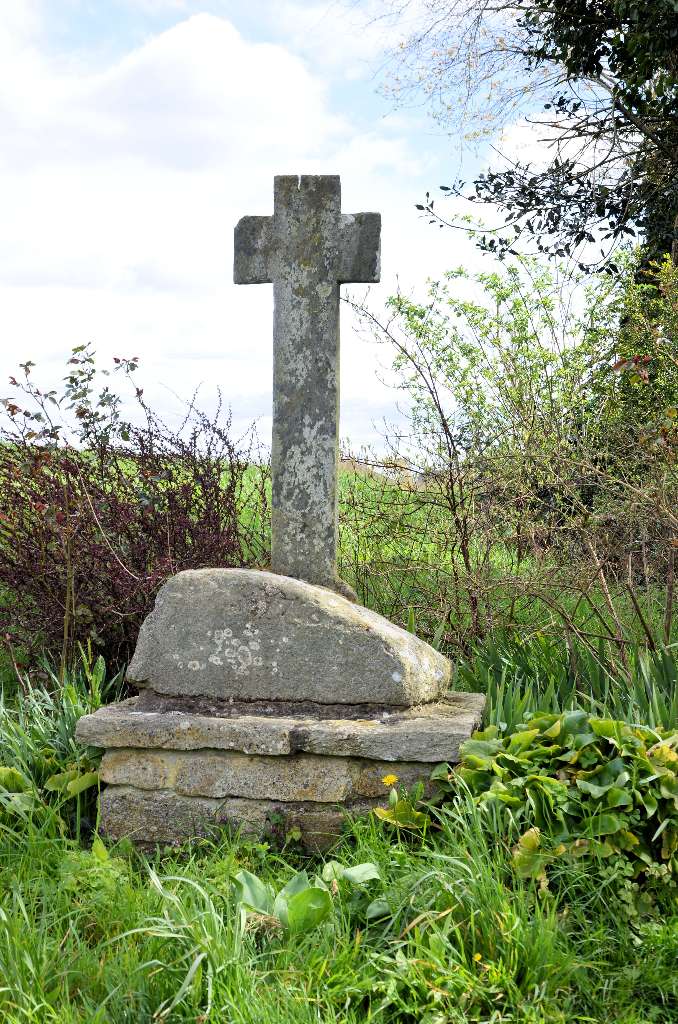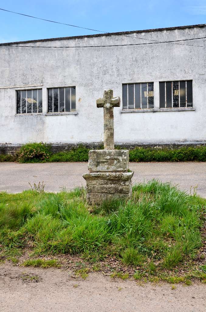 Croix de chemin Sur un talus, socle monolithe en granit, croix monolithe à pans biseautés avant les extrémités des bras, ergots en parties supérieure du fût.