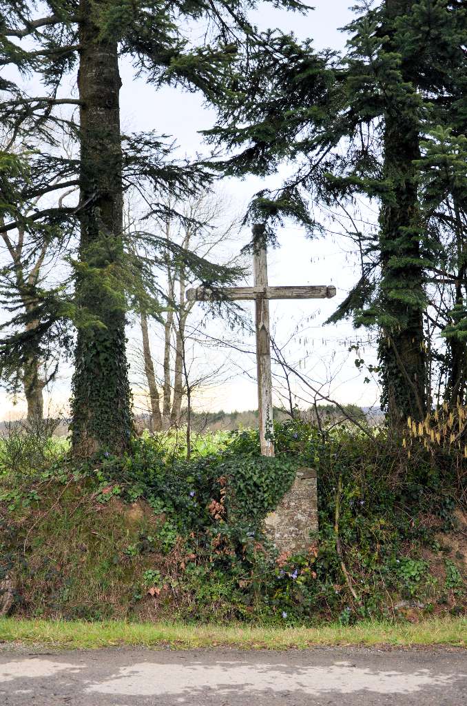 Croix Soubassement en maçonnerie de moellons (granit,schiste), couronnement en ciment, croix en bois peinte en blanc. Ãrigée par la famille Gaspais vers 1978 en remplacement d'une ancienne croix également en bois.